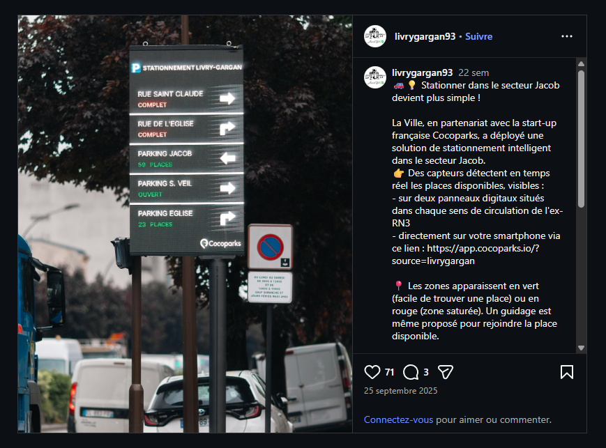 The town of Livry-Gargan(Seine-Saint-Denis) is the first commune in the 93 département to deploy an intelligent parking solution. In partnership with Cocoparks, it has equipped its town center with real-time sensors, digital signs and a mobile application – to smooth traffic flow and modernize the experience for motorists. The project, co-financed by the Metropole du Grand Paris and the Île-de-France Region, was up and running in less than 3 months.
