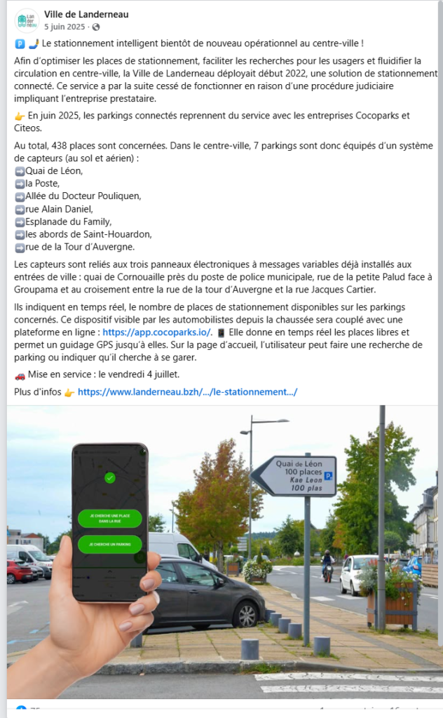 Le 4 juillet 2025, le stationnement connecté de Landerneau est de nouveau opérationnel.